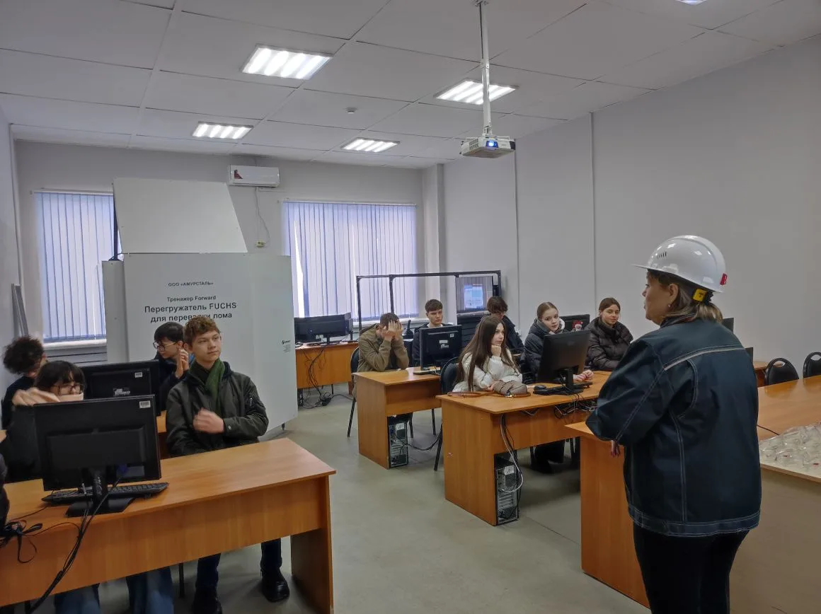 Учащиеся строительного класса Гимназии № 45 г. Комсомольска-на-Амуре 10 апреля 2026 г. посетили крупный промышленный комплекс ООО «Амурсталь», включающий электросталеплавильный и сортопрокатный, ремонтно-механический, железнодорожный, автотранспортный, кислородно-газовый, энергетический, электроремонтный цехи, цех переработки лома и другие подразделения.